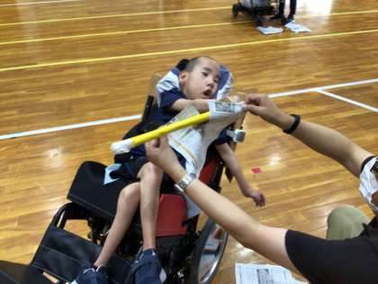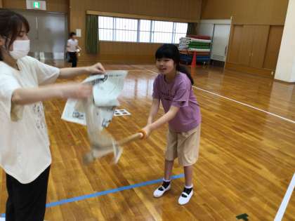 5月から体育の授業で剣道に取り組んでいます。目で目標をとらえる、竹刀を手のひらで持つ、腕を振り下ろすことを目標に置いてます。
