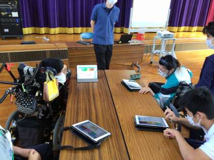 全校の教育課程ABの学習をする児童生徒を対象にデジタル・シティズンシップ教育の授業を行いました。スマホアプリの会社「LINE」の教材「楽しいコミュニケーションを考えよう」と学習用タブレットのSKYMENUを使用しました。