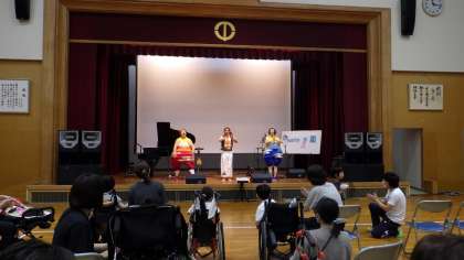 7月11,12日の2日間に渡って、児童生徒に大人気、エビカニクスでおなじみの音楽ユニット、ケロポンズさんが来校されました。パネルシアターや、本物そっくりの動物の鳴き声を織り交ぜた曲、へそべりーちゃんの質問コーナーと、生演奏の醍醐味を思う存分に味わいました。歌って踊って笑顔いっぱいの時間を満喫しました。ステージの合間に教室に顔を出してくださり、みんなにあいさつをしてくださいました。サプライズの来訪に喜びの声が教室中に響き渡りました。ケロポンズのインスタグラムやFacebookに当日の様子がアップされています。よろしければご覧ください。