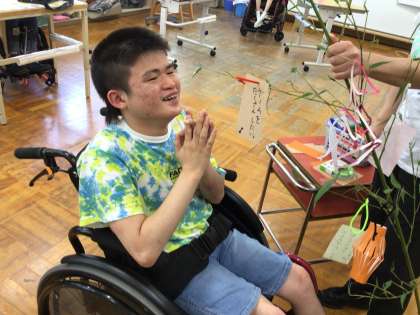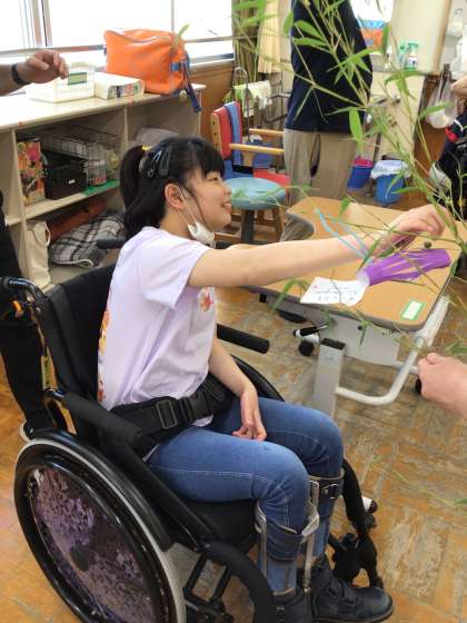 【高等部の様子】七夕飾りを作ろう 公開日 2023/08/01 更新日 2023/08/01 高等部の様子 高等部3年生2・3・4組では、生活単元学習の授業で、7月7日の七夕に向けて飾りや短冊を作りました。笹に飾ってみると、風に吹かれて飾りや短冊が揺れて、夏の訪れを感じることができました。