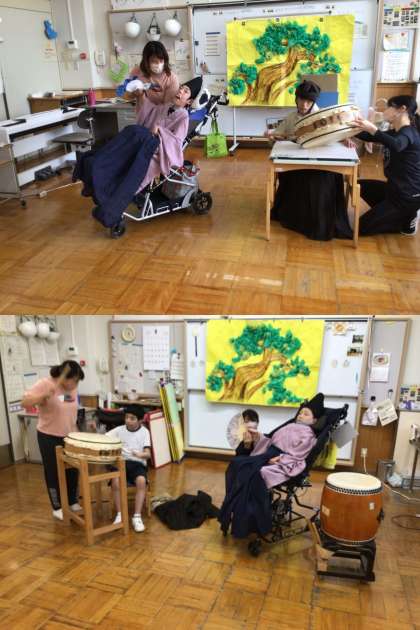 授業の様子 音楽 能 公開日 2023/09/13 更新日 2023/09/13 中学部の様子 6月から音楽の授業で能に取り組んでいます。自分たちで、能楽堂の松の背景を作り、衣装を着て、演者になりきって能を演じました。 『敦盛』という作品のなかの『中之舞』という曲を演じました。独特な曲調に乗って、緊張感がある中、能を楽しむことができました。