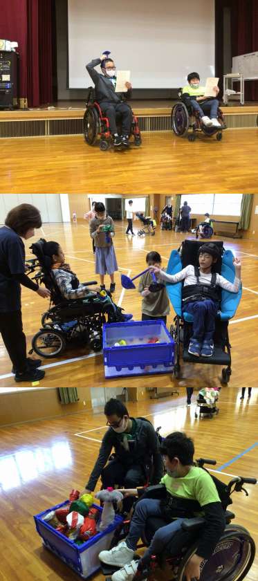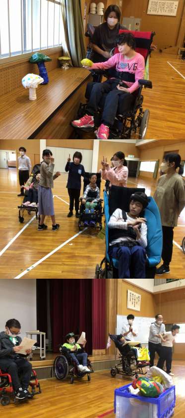 秋にちなんで、キノコ狩りゲームを行いました。アリーナ内に並べられたキノコを採ってくるゲームです。皆がアリーナ中に散らばってキノコを採ってくるときは、大いに盛り上がりました。