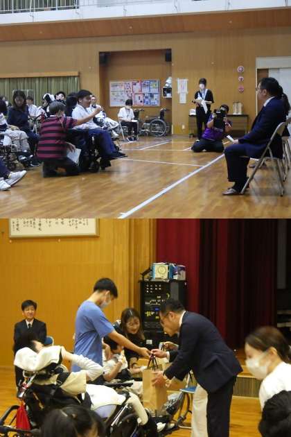 TE Connectivity Japan 合同会社(旧社名:タイコエレクトロニクスジャパン合同会社)様より、エアートランポリンやスヌーズレンを寄贈していただきました。10月3日(木)に行われた寄贈受け取り式では、高等部の代表生徒を中心にお礼の言葉を伝えたり、お礼の品(高等部木工班の作品)を贈呈したりして感謝の気持ちを伝えました。エアートランポリンの体験では、子どもも大人も笑顔いっぱい!元気よく飛び跳ねました。その後は、アリーナを暗くしてスヌーズレンタイム。癒しの空間を楽しみました。エアートランポリンもスヌーズレンも大切に使っていきたいです。