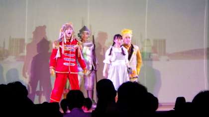 「オズの魔法使い」は、著者ライマン・フランク・ボームの人気作品です。また、今回はプロジェクションマッピングを導入したミュージカルで、迫力のある場面が次々に展開されました。子どもたちはキラキラと目を輝かせ、音楽にのって手をたたいたり、動かしたりして、ドロシーの歌声や演じている方々のダンスを鑑賞していました。
