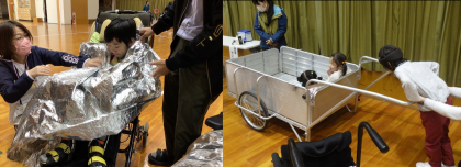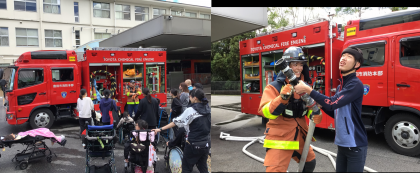 その後は各部に分かれて、防災関連物品の展示や消防車の放水・車両を見学しました。消防車の放水の迫力にみな驚き、車両の装備に見入っていました。また、防災時の避難用リヤカーやサバイバルシートなどの物品のお試しも盛り上がっていました。