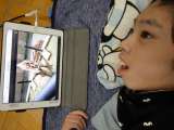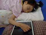 うつ伏せ姿勢でタブレット端末の画面に手を伸ばす活動に取り組んでいます。「タップ...